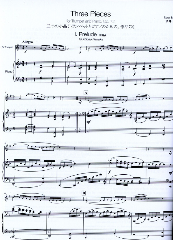 Three Pieces ist eine Suite für Trompete und Klavier, die drei unterschiedliche musikalische Charaktere zu einem stimmigen Ganzen zusammenführt: ein mäßig schnelles Prelude nach Art eines Menuetts, eine lyrische, von fanfareartigen Abschnitten unterbrochene Ballade sowie eine mitreißende Tarantella als Kehraus.