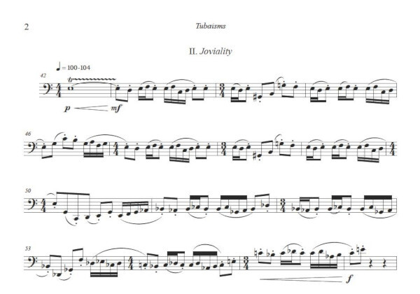 is in three short movements: From the Depths, Joviality, and Oompah! Each displays a variety of the unique characteristics of the tuba without using extended techniques or extreme range. The accessible musical language, coupled with the soaring melodies and intriguing rhythms, make this an audience-friendly concert work as well as an impressive contest piece. Because of its modest technical demands, it is suitable for performance by advanced high school and college-level performers. One score is provided. (7:20)
