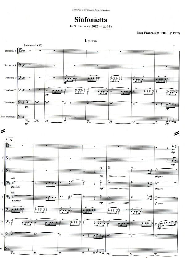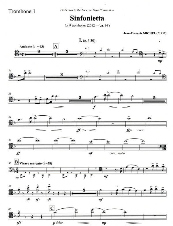 The commission of this Sinfonietta by Jean-François Michel for the Swiss trombone ensemble Lucerne Bone Connection (cond. Markus Wuest) has been made possible thanks to the generous assistance of Ursula Jones-Strebi in memoriam Philip Jones (1928-2000), her husband, who was one of the great pioneers of brass chamber music.