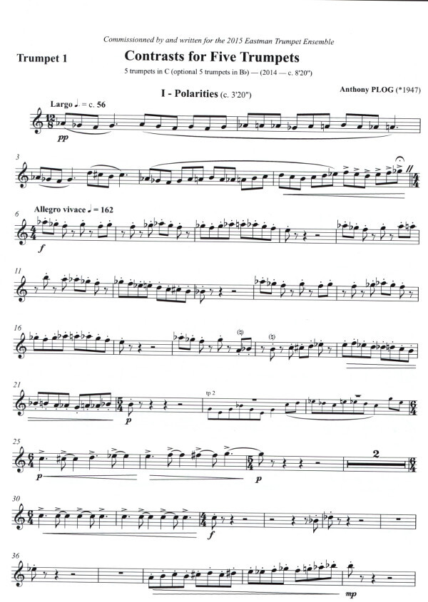 This outstanding and exciting musical contribution to the contemporary repertoire for five trumpets was commissioned by, and written for the 2015 Eastman Trumpet Ensemble (Steve Felix, Samuel Huss, Michael Kent, Dovas Lietuvninkas, Andrew Psarris) of the Eastman School of Music and the director of wind studies, Dr. Mark Davis Scatterday, contributor.