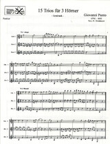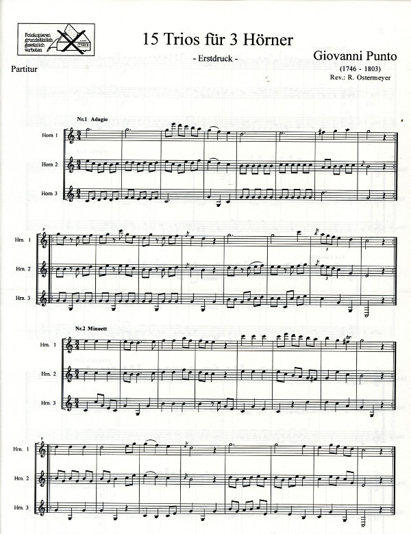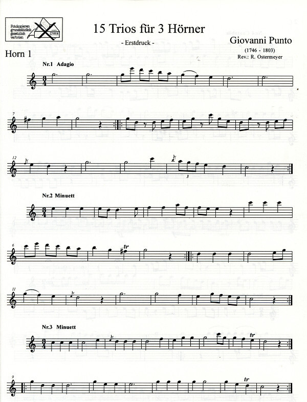 Die 15 Trios von Giovanni Punto, zusammen mit Horntrios von seinem Lehrer Anton Hampel in einer Pariser Abschrift erhalten, überraschen durch die hohe Lage des 1. Horns. Es scheinen relativ frühe Werke Puntos zu sein, seine im Druck überlieferten Werke nutzen fast ausschließlich die Mittellage. Vielleicht entstanden Sie noch in seiner Unterrichtszeit in Dresden unter der Aufsicht von Hampel.