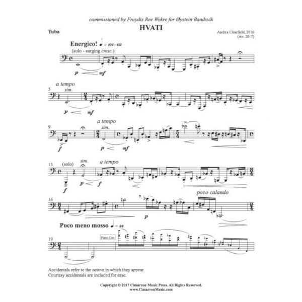 HVATI was commissioned by acclaimed Norwegian hornist Froydis Ree Wekre for the renowned Norwegian tuba soloist Ïystein Baadsvik. The title is Old Norse for "motivator" or "catalyst". This work was inspired by "hvati" with its vigorous energy and stimuli; instruments initiate movement and change. The piece was also informed by having had the special opportunity to meet with Ïystein in Trondheim, Norway, thanks to Froydis Ree Wekre.