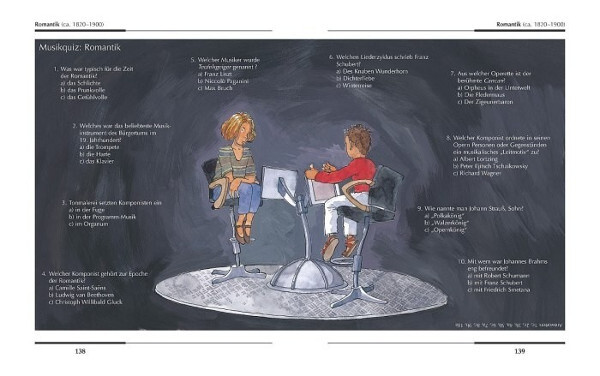 Antworten auf diese Fragen werden sowohl im Erzähltext als auch auf den attraktiv gestalteten Infoseiten gegeben. Mit den Schmunzelgeschichten kann man sich über große Komponisten amüsieren und in den verschiedenen Musikquiz sein Wissen testen.