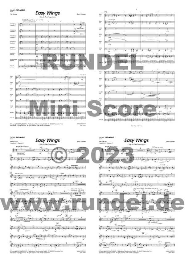 Zu zweit geht man bekanntlich leichter durchs Leben als allein, und wer solo ist, wünscht sich meist einen zweiten "Solisten" an seiner Seite. So gesehen erfüllt Lars Ericsen ein sehr grundlegendes Bedürfnis, indem er mit "Easy Wings" (zu Deutsch: "Leichte Flügel") ein Solostück für zwei Flügelhörner vorlegt. Über einem sanften, fröhlichen Bossa-Nova-Rhythmus scheinen die Solisten unbeschwert, wahrhaft mit leichten Flügeln, zu fliegen. Kein Wunder, wenn man zu zweit ist! (Die "Wings" sind natürlich auch eine dezente Anspielung auf das Instrument "Flügel"-Horn.)
